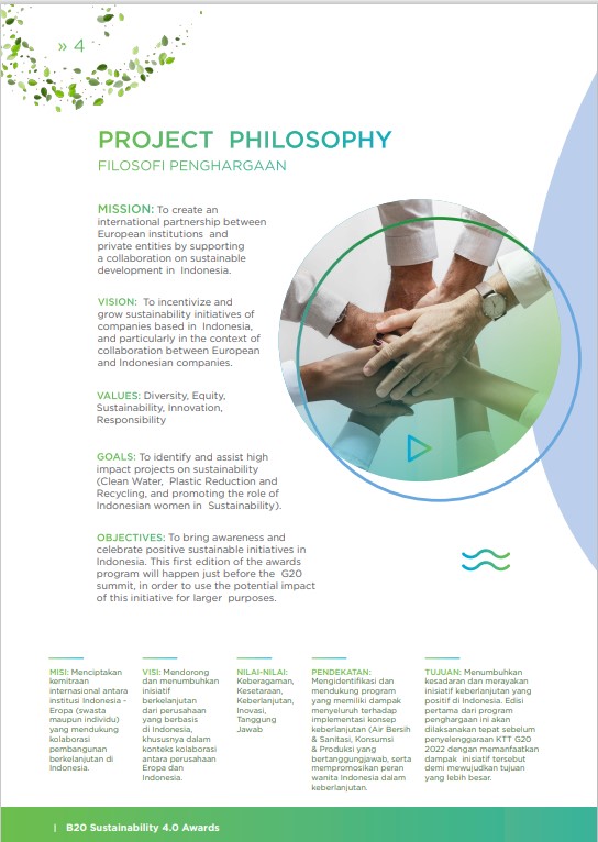 B20 Sustainability 4.0 Awards merupakan bagian dari side events B20 yang merayakan partisipasi pelaku bisnis dan individu yang menanamkan praktik keberlangsungan dalam proses dan strategi bisnis dengan mengintegrasikan aspek lingkungan dan masyarakat. Swiss – Indonesia Chamber of Commerce (SwissCham) bekerja sama dengan Kamar Dagang dan Industri Indonesia (KADIN) dan Kamar Dagang dan Industri Eropa (EuroCham), serta kemitraan bersama kamar dagang lainnya seperti Kamar Dagang Inggris di Indonesia (BritCham), Asosiasi Bisnis Italia di Indonesia (IBAI), Kamar Dagang dan Industri Perancis (IFCCI), Perkumpulan Ekonomi Indonesia Jerman (Ekonid) menyelenggarakan program penghargaan yang bertujuan menanamkan kesadaran akan kelestarian lingkungan dengan cara mengidentifikasi program yang memberikan dampak siginifikan yang diinisiasi sektor bisnis swasta maupun individu yang beroperasi di Indonesia.