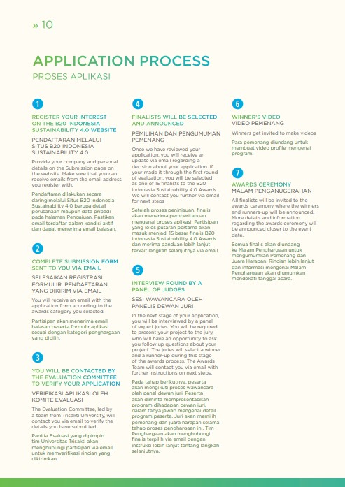 Melalui pengalaman puluhan tahun dalam menerapkan bisnis berkelanjutan, penyelenggaraan B20 Sustainability Awards diharapkan dapat menjadi program yang dibanggakan perusahaan. Kami mengundang partisipasi dari berbagai pelaku bisnis di Indonesia. SwissCham’s Sustainability Awards mengapresiasi inovasi yang dilakukan pelaku bisnis maupun individu yang berupaya meningkatkan praktik berkelanjutan yang inklusif di dalam aktivitas mereka.