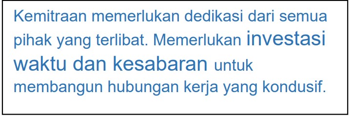 Ada tahapan/fase dalam kemitraan yang berjalan lebih lambat karena kesiapan setiap mitra yang berbeda. Misalnya peran dan tugas Pemkab Timor Tengah Selatan dan yayasan Besipae pada tahap awal belum jelas dan belum dieksplorasi. Kondisi ini sesungguhnya adalah kesempatan untuk bekerja sama dengan cakupan tugas fungsi pokok yang lebih besar sebelum semua pihak siap untuk bermitra.