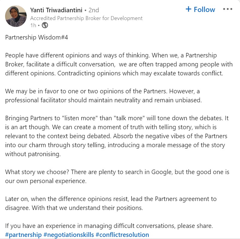 Jika Anda memiliki pengalaman menarik dalam menangani konflik atau perselisihan dalam sebuah hubungan kemitraan, silakan berkomentar. Atau, pertanyaan seputar penanganan konflik di antara para pihak? Silakan ajukan dalam kolom komentar dan akan direspon oleh Bu Yanti.