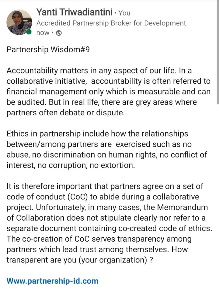 Kali ini, Yanti Triadiantini ‘menyentil’ perilaku antara para pihak yang bermitra, yang sepakat bersikap transparan di awal namun tak kunjung merealisasikannya, semisal dalam bentuk Code of Ethics. Seberapa transparan organisasi Anda dalam menjalankannya?